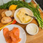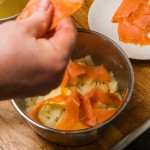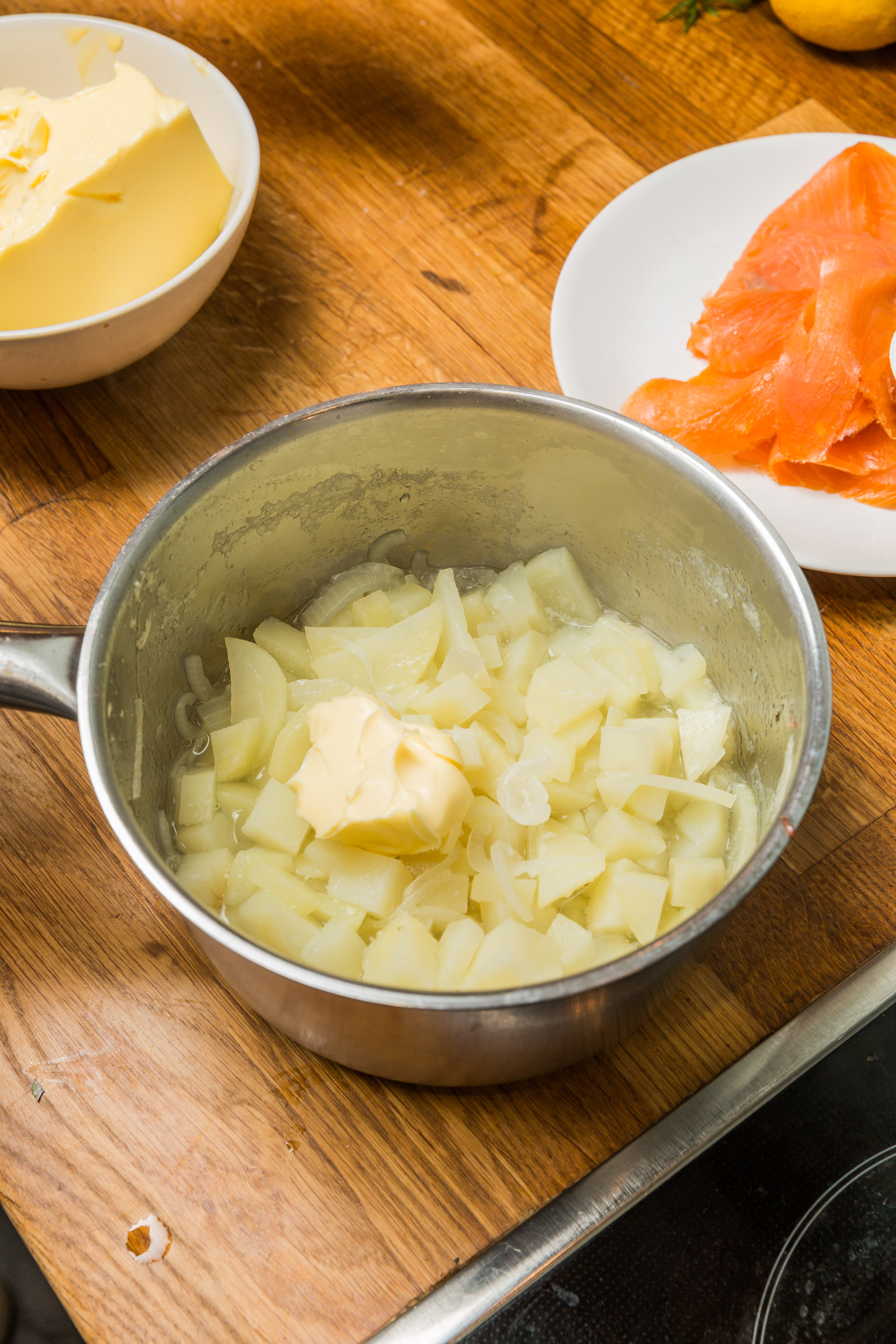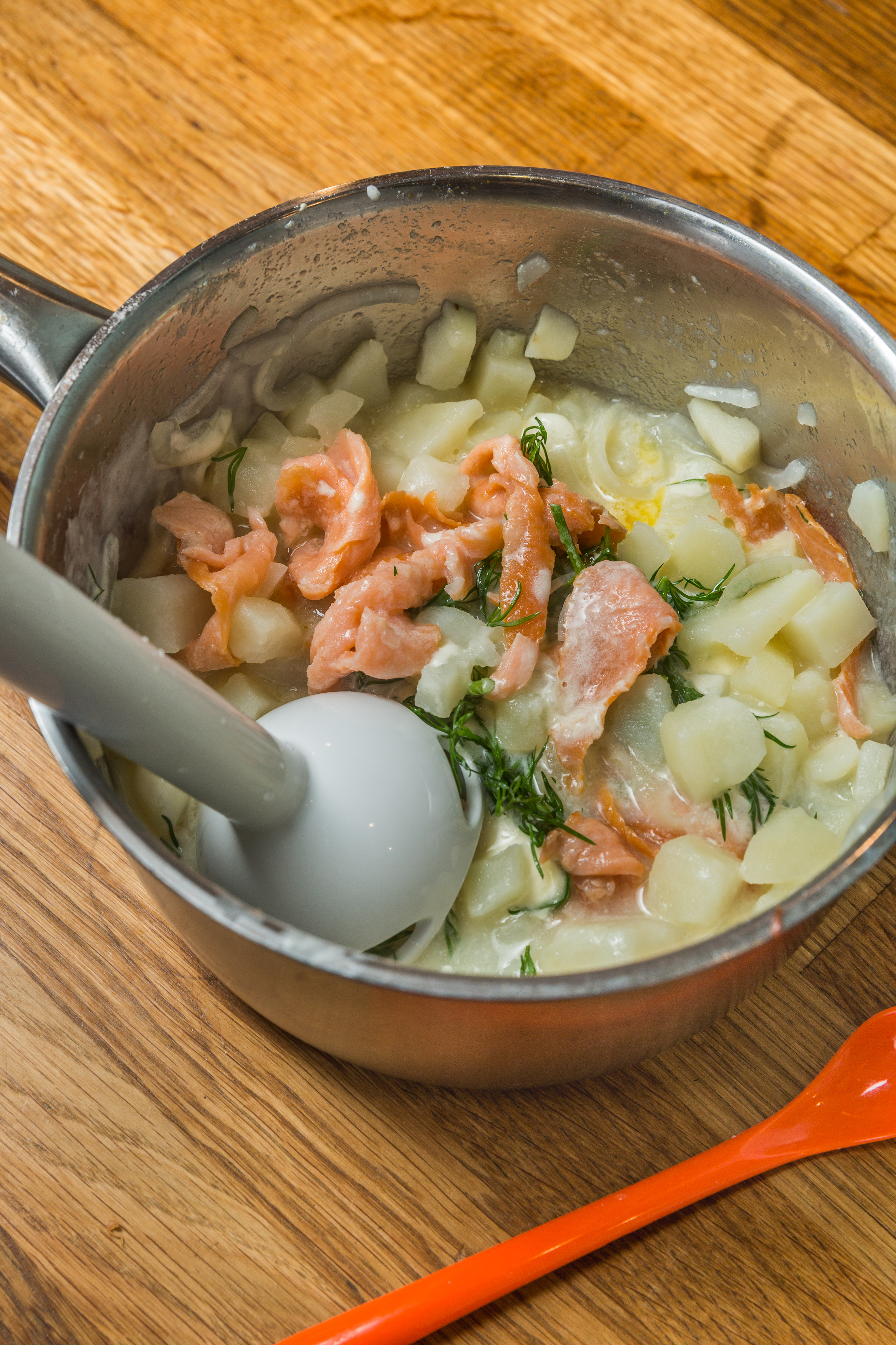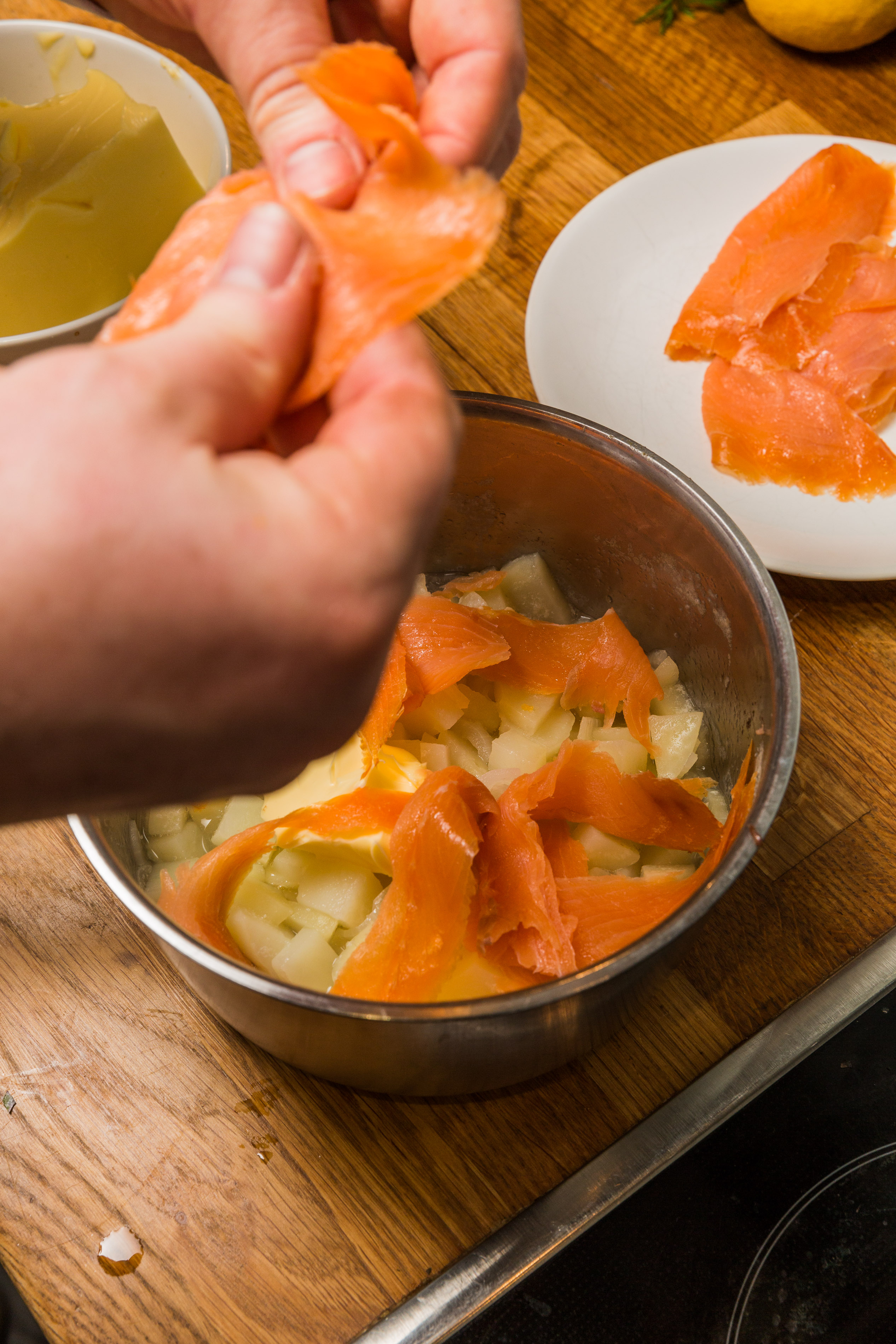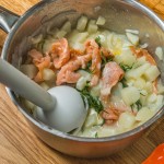 Häll av det mesta av vattnet. Strimla laxen och lägg den tillsammans med potatisen.