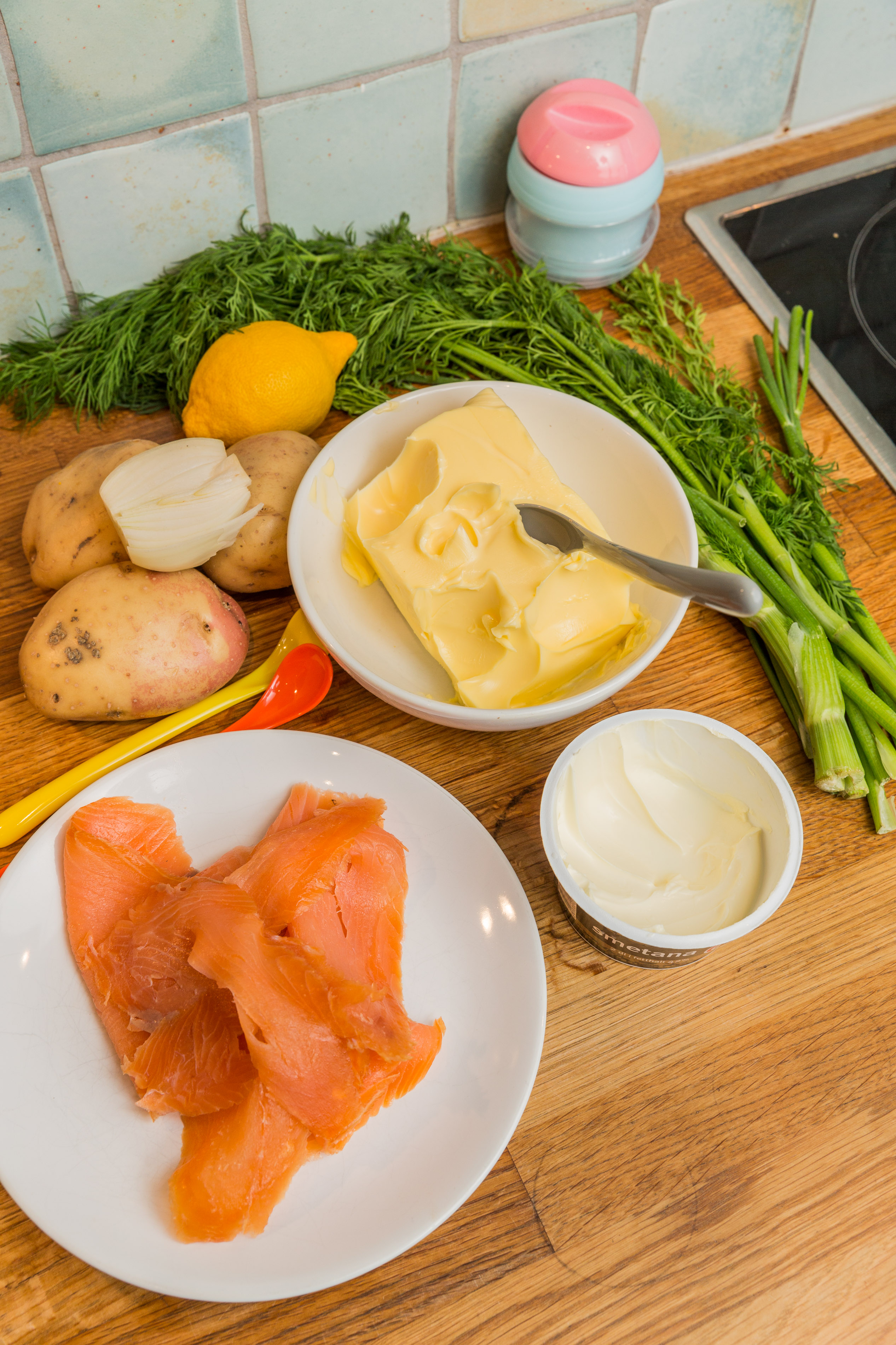 Mixa med smör och crème fraîche. Smaka av med citronjuice och dill.