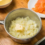 Skala och tärna potatisen i små bitar. Lägg potatisen i en kastrull och täck med vatten. Koka tills potatisen är mjuk.