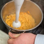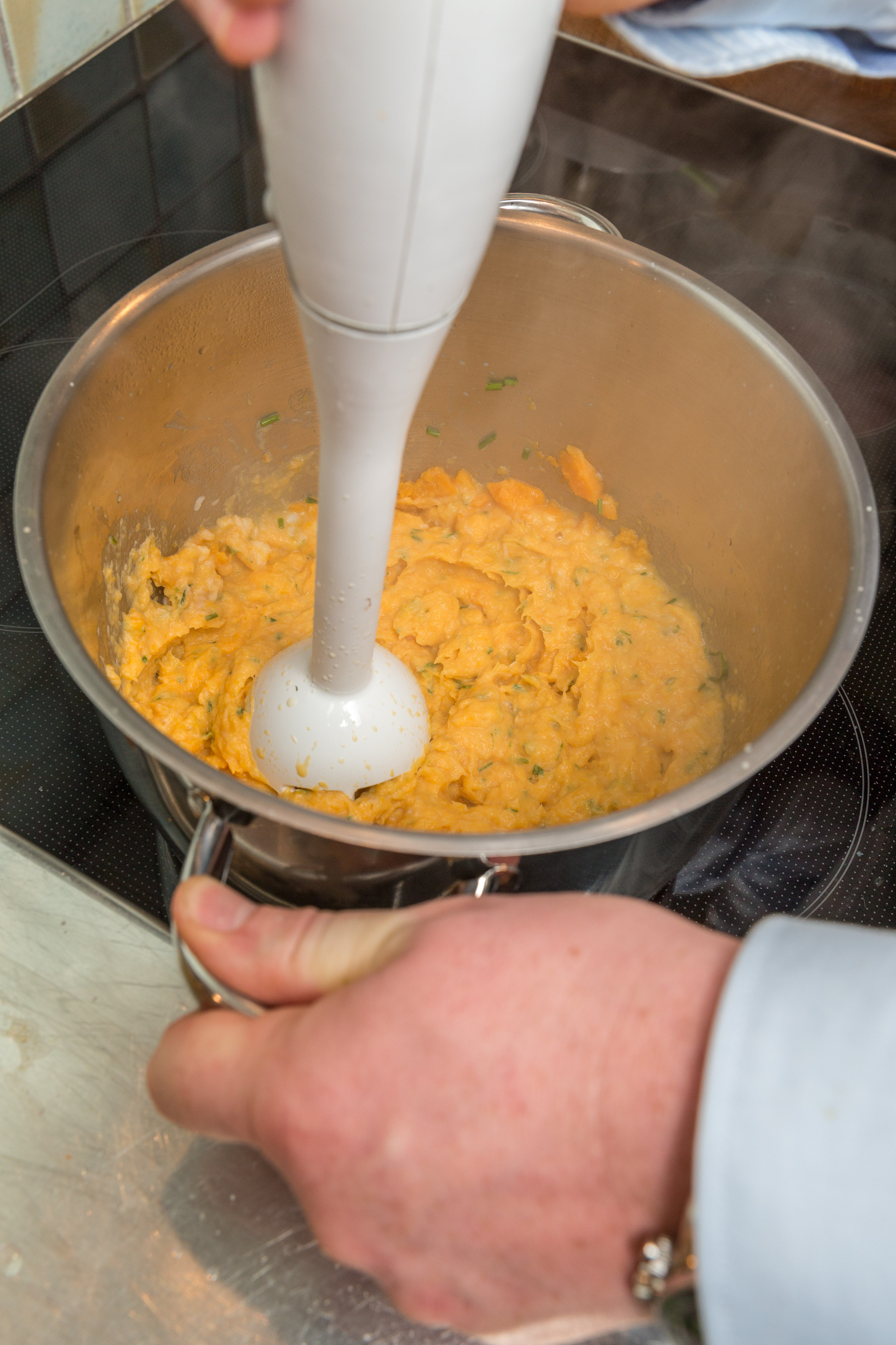 Häll av det mesta av vätskan och mixa till önskad konsistens, tillsammans med smör, grädde och citronjuice. Avsluta med hackad gräslök.