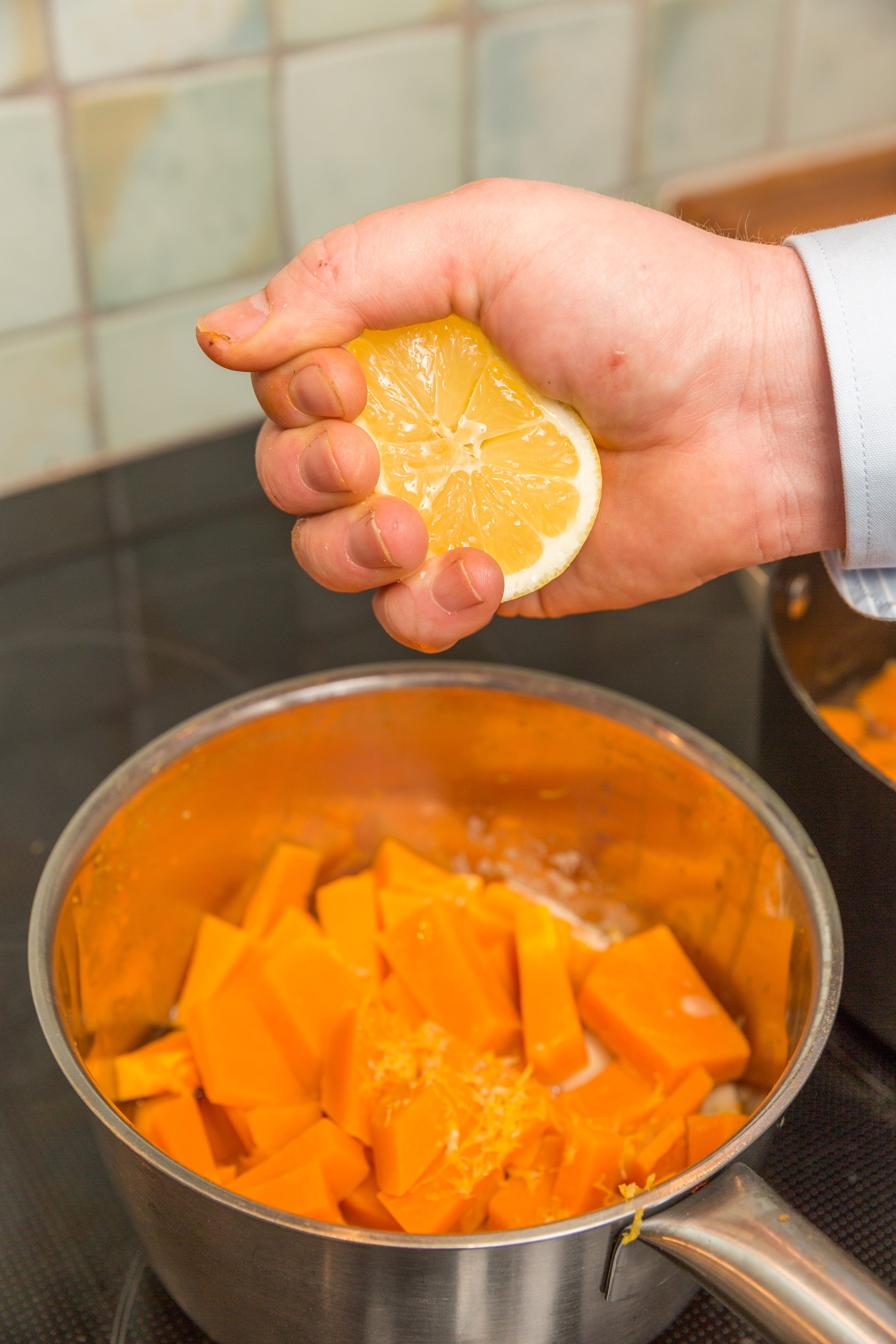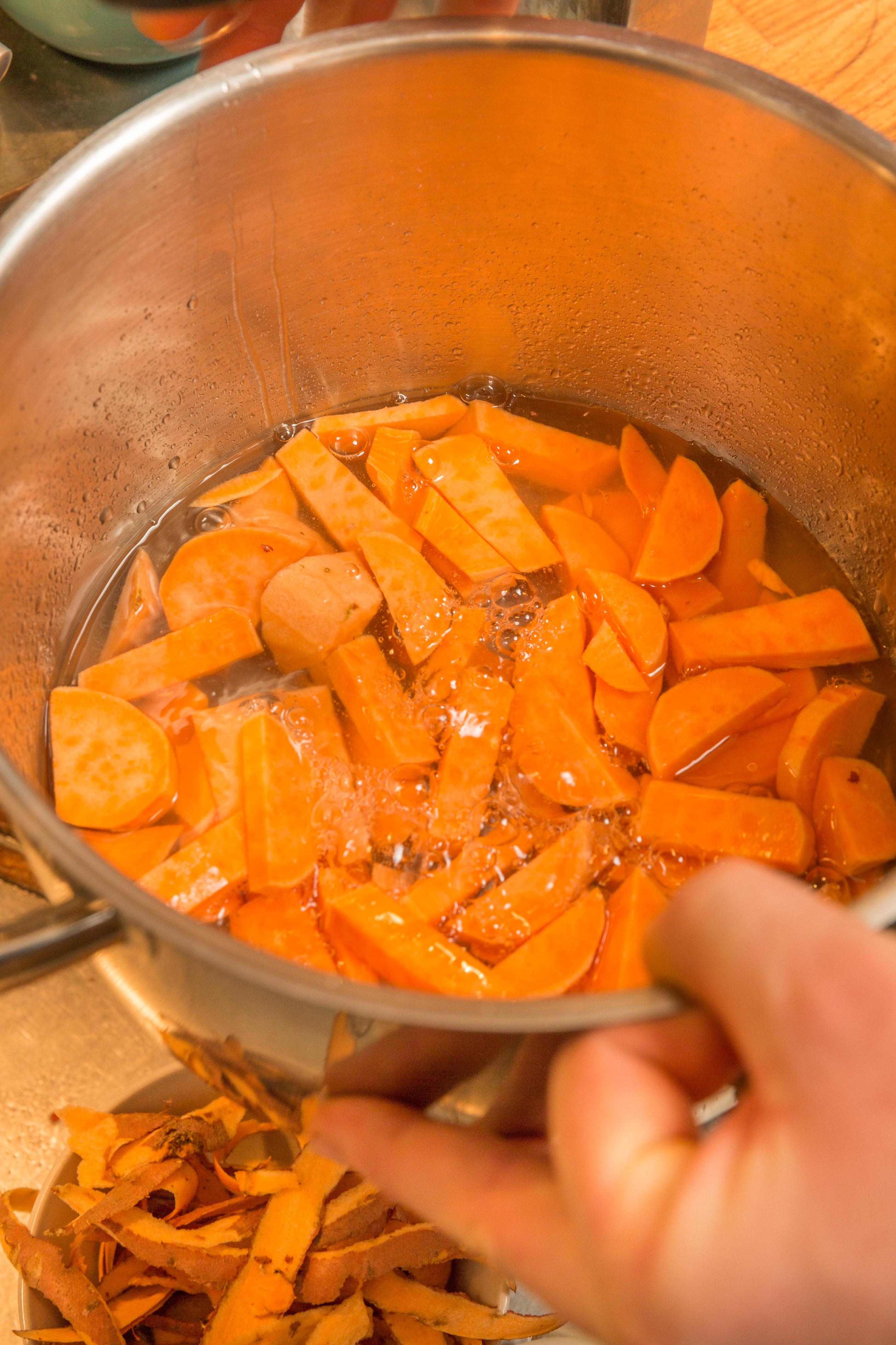 Skala och tärna sötpotatisen. Lägg i en kastrull, täck med vatten och koka i 20 min. Tillsätt koljan, grovt tärnad.
